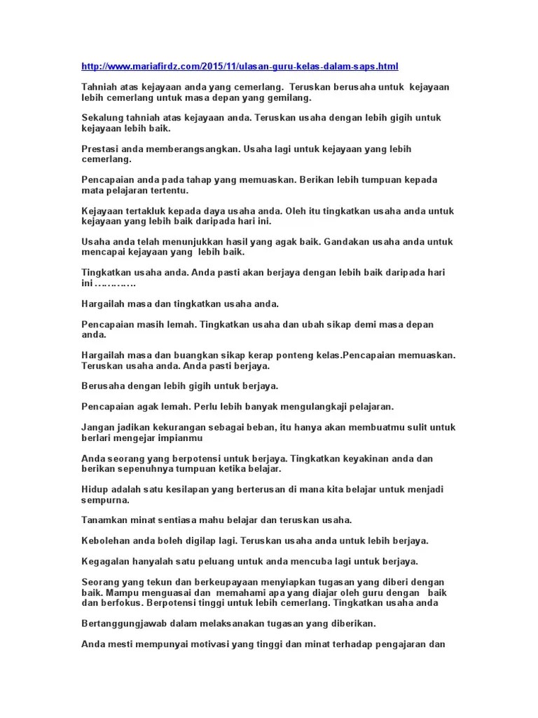 Kat bawah ni mf kongsikan beberapa ulasan guru kelas untuk diisi dalam saps.